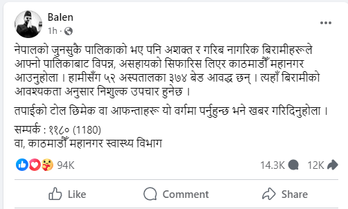 ‘नेपालको जुनसुकै पालिकाको भए पनि अशक्त र गरिब नागरिक बिरामीहरूले आफ्नो पालिकाबाट विपन्न, असहायको सिफारिस लिएर काठमाडौं महानगर आउनुहोला,’ उनले आफ्नो फेसबुकमा लेखेका छन्, ‘हामीसँग ५२ अस्पतालका ३७४ बेड छन् । जहाँ बिरामीको आवश्यकता अनुसार निःशुल्क उपचार हुनेछ ।’